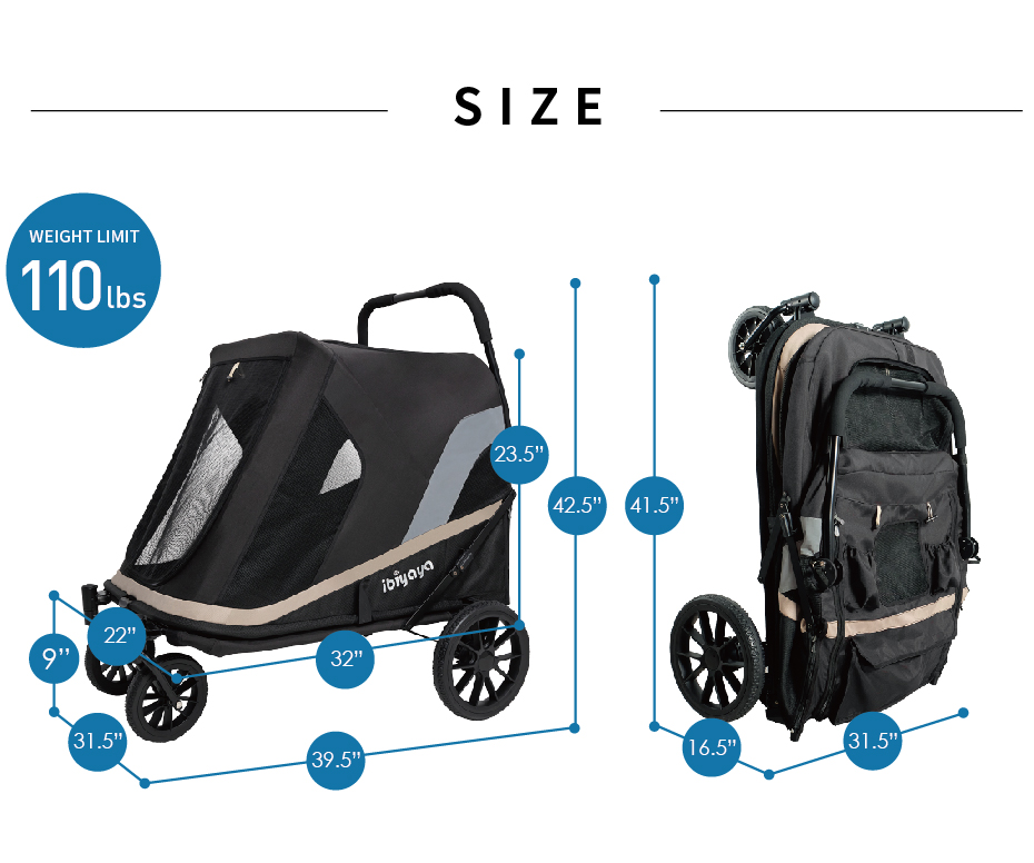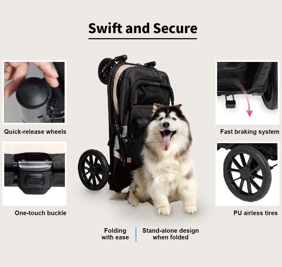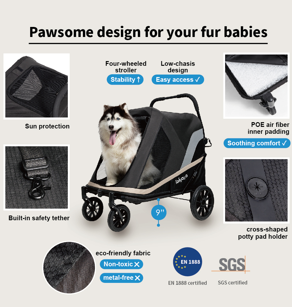 Il passeggino per cani fino a 50Kg Grand Cruiser è progettato con telaio basso ed è dotato di apertura anticaduta per facilitare l’accesso al passeggino ai cani grandi e anziani!